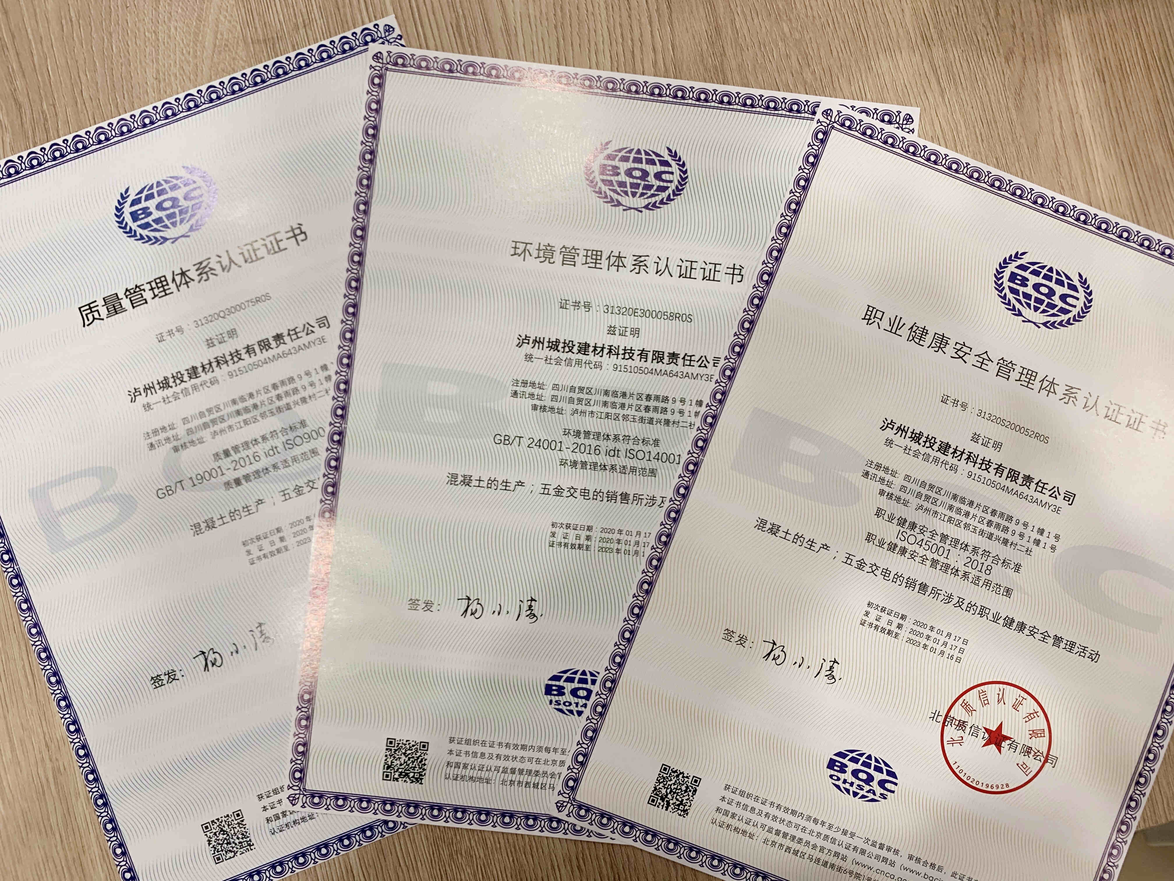 3月16日,瀘州城投建材科技有限責(zé)任公司順利取得ISO9001質(zhì)量管理體系、ISO14001環(huán)境管理體系及ISO45001職業(yè)健康安全管理體系認(rèn)證。