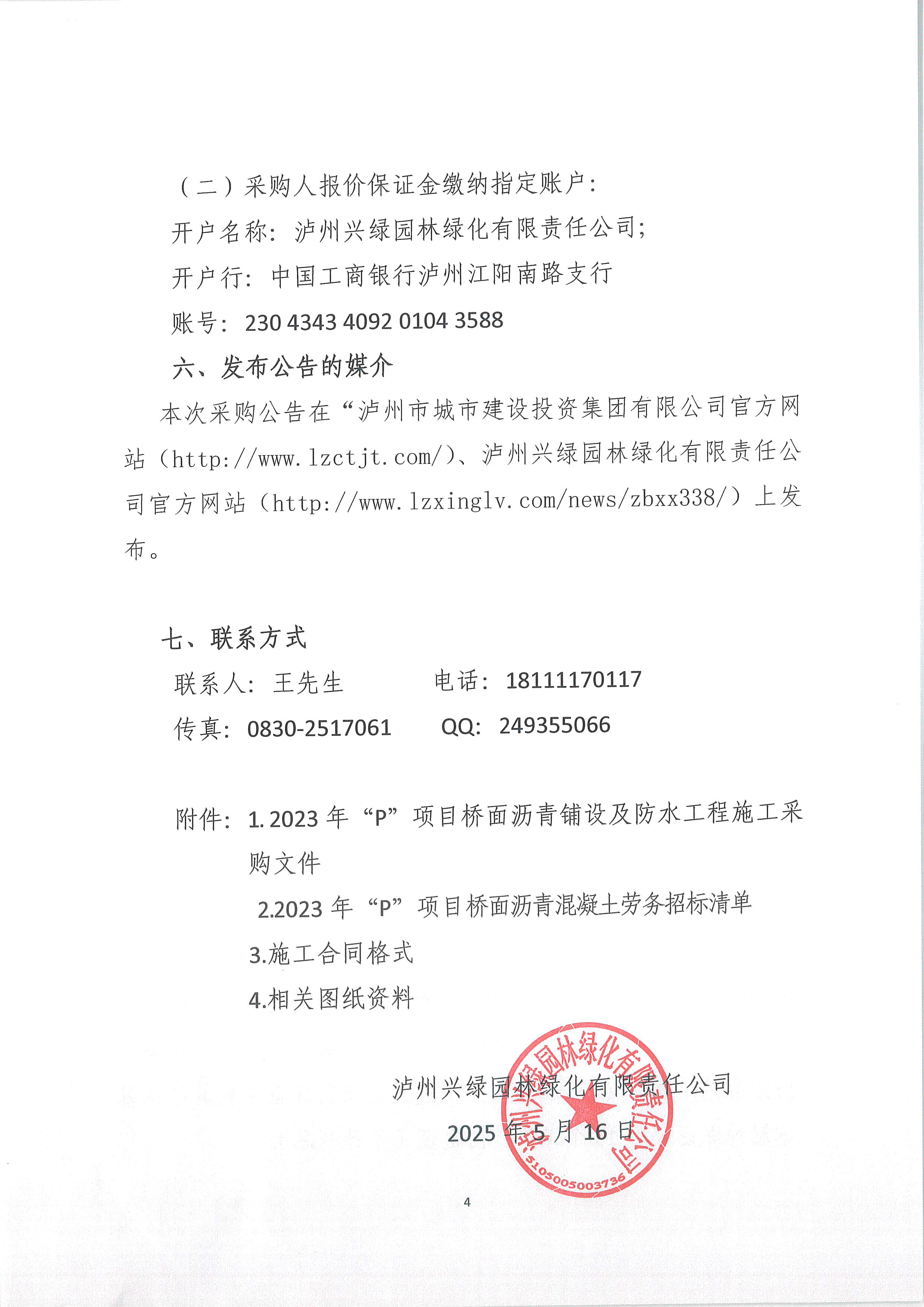 瀘州興綠園林綠化有限責任公司關(guān)于2023年“P”項目橋面瀝青鋪設(shè)及防水工程施工班組采購公告