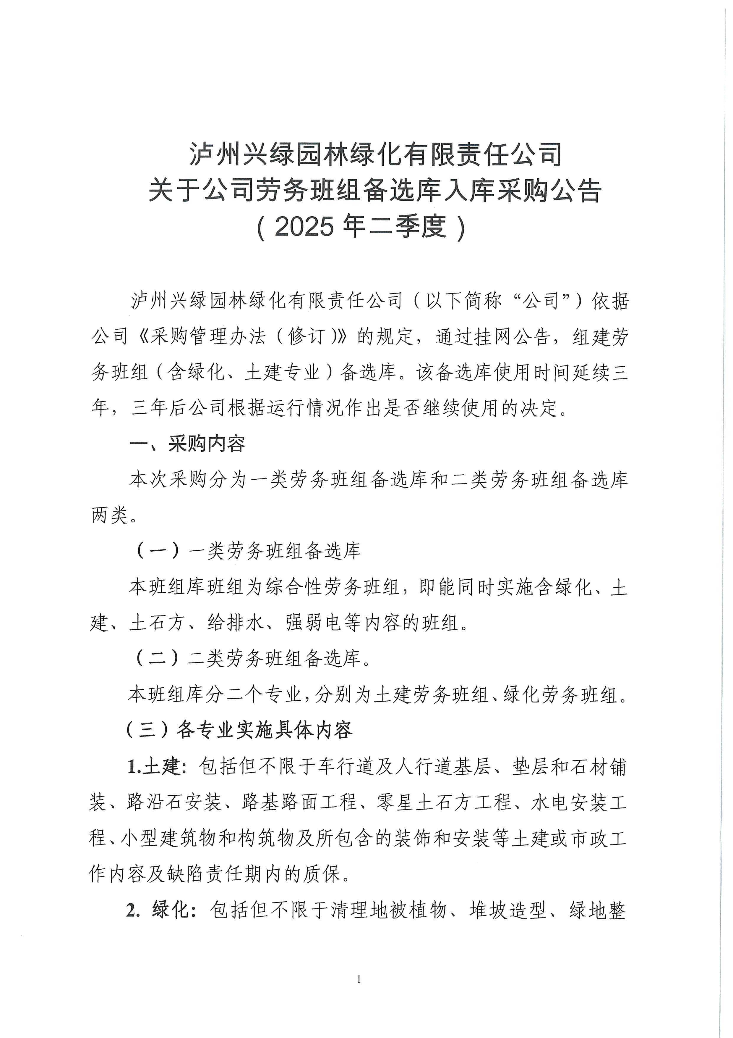 瀘州興綠園林綠化有限責任公司關于公司勞務班組備選庫入庫采購公告(2025年二季度)