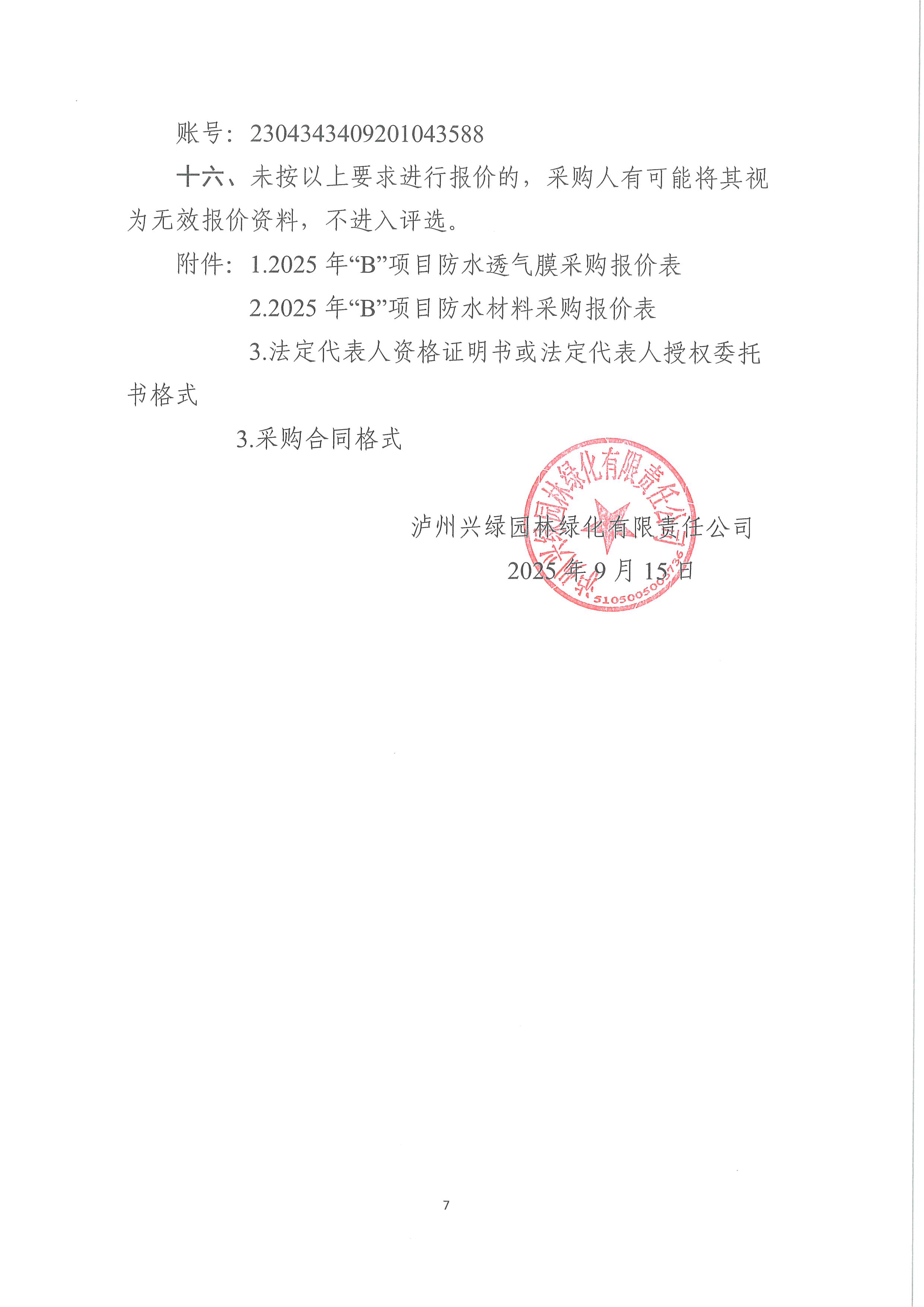 瀘州興綠園林綠化有限責(zé)任公司關(guān)于 2025年“B”項(xiàng)目防水透氣膜和防水材料采購詢價(jià)公告